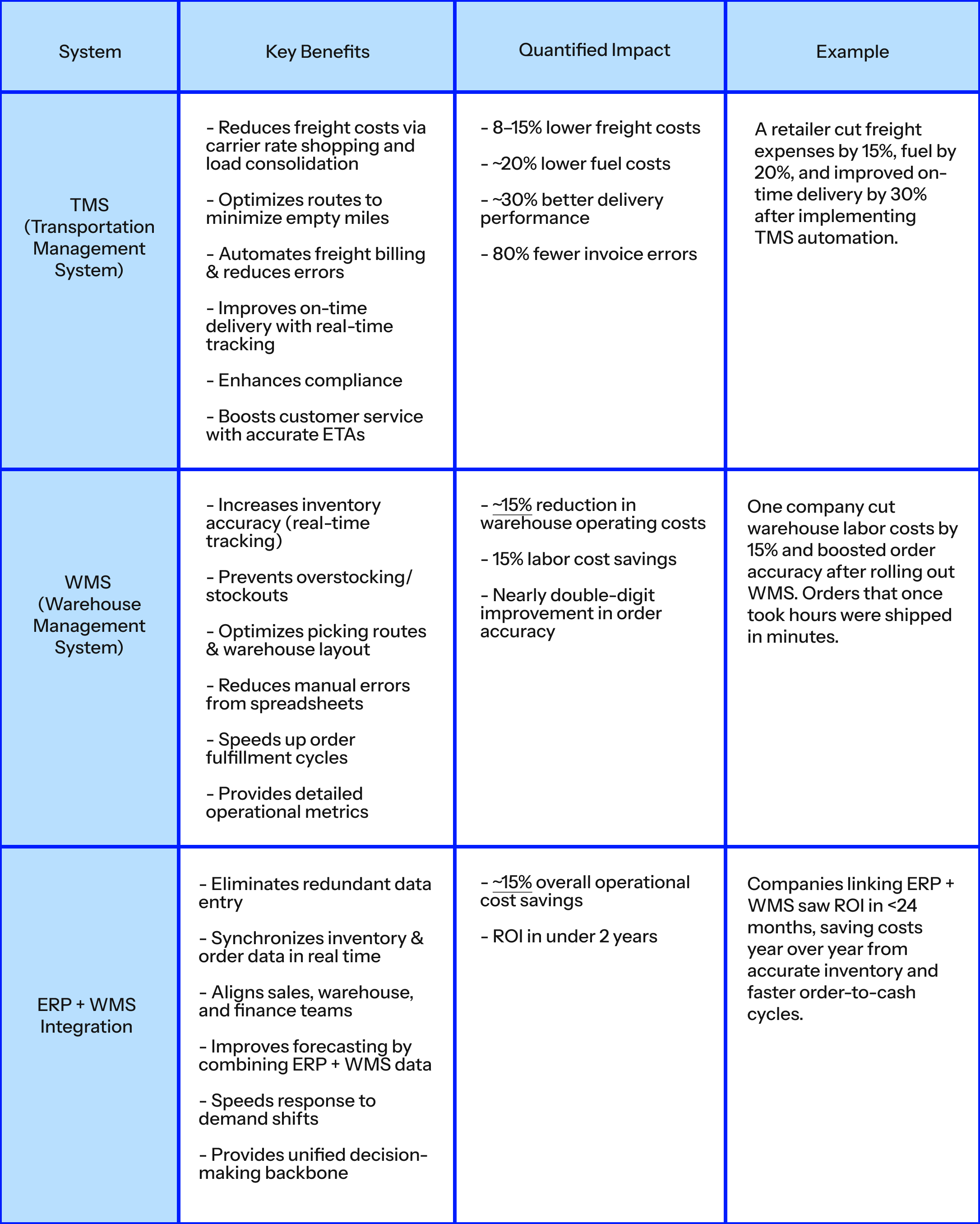 3. Integrating the ERP with these systems adds an extra layer of savings by eliminating manual processes and errors between departments. For example, automatic data flow prevents revenue leakage from missed billing or incorrect charges. If billing errors or inventory mistakes previously cost even a few percentage points of revenue, the integration might save on the order of $100k+ by tightening financial controls. Real-time data also improves financial decisions, e.g., avoiding costly emergency shipments thanks to better planning. While harder to quantify, these savings (in reduced errors, better procurement decisions, etc.) might contribute another $100k–$200k annually. The integration also enables consolidated shipments and optimized planning that further scale up savings. By having all systems linked, the company can, for instance, combine orders into fuller truckloads (leveraging TMS suggestions) and plan production or ordering to minimize logistics costs. This holistic optimization could easily push the total savings closer to the $1.5M goal.