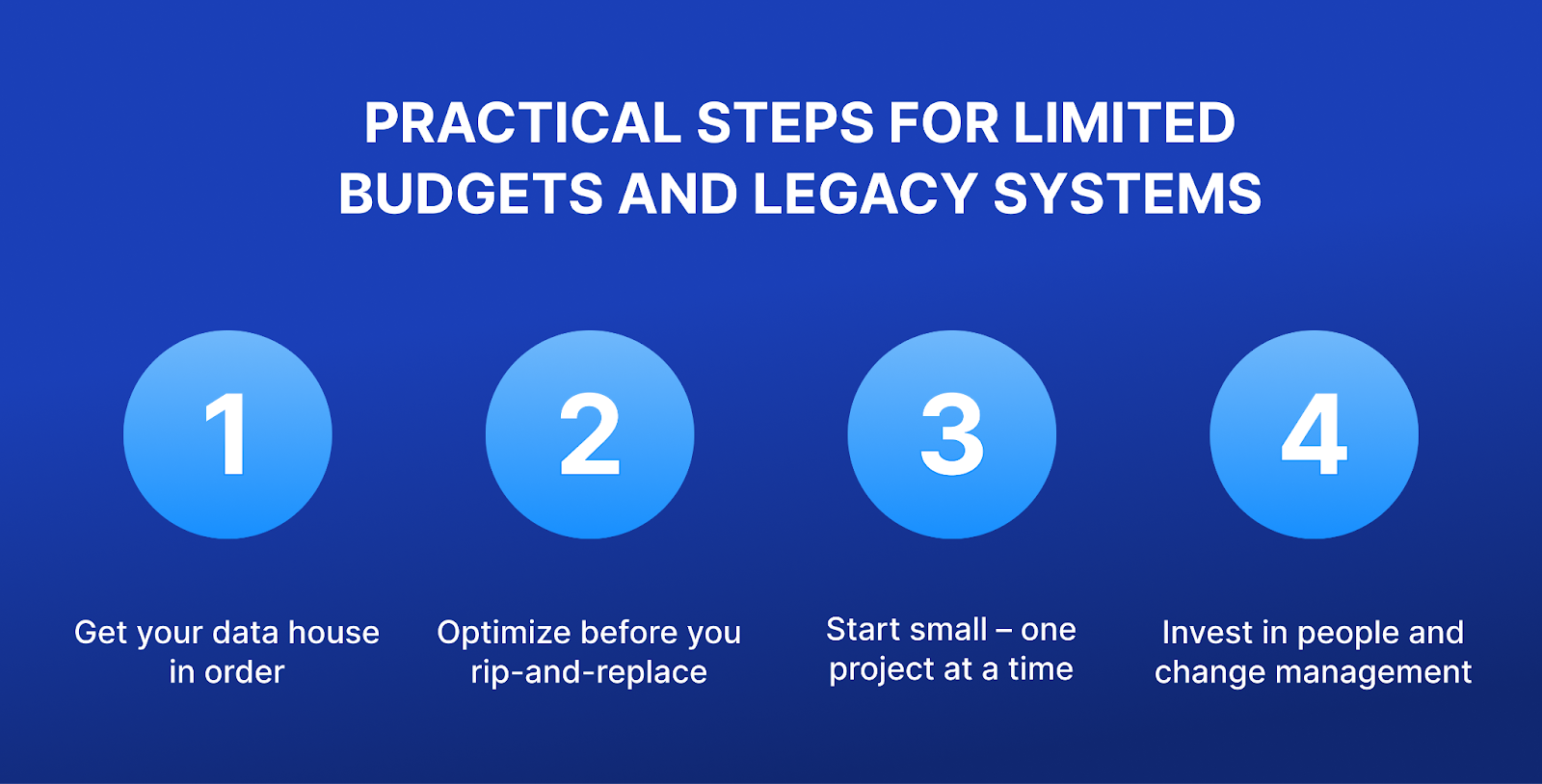 2. If a complete systems overhaul is not within your budget, consider ways to improve your existing systems. Often, there are affordable add-on solutions or middleware that can extend the life of legacy software. You might implement a modern analytics dashboard on top of an old ERP (enterprise resource planning) system to gain better visibility, or use a robotic process automation (RPA) tool to automate data entry tasks. The idea is to improve old systems rather than replace them immediately. This could involve utilizing cloud services or APIs to connect older systems with new features. The goal is to upgrade without uprooting your current setup, maximizing the value of what you have got through targeted technological enhancements.